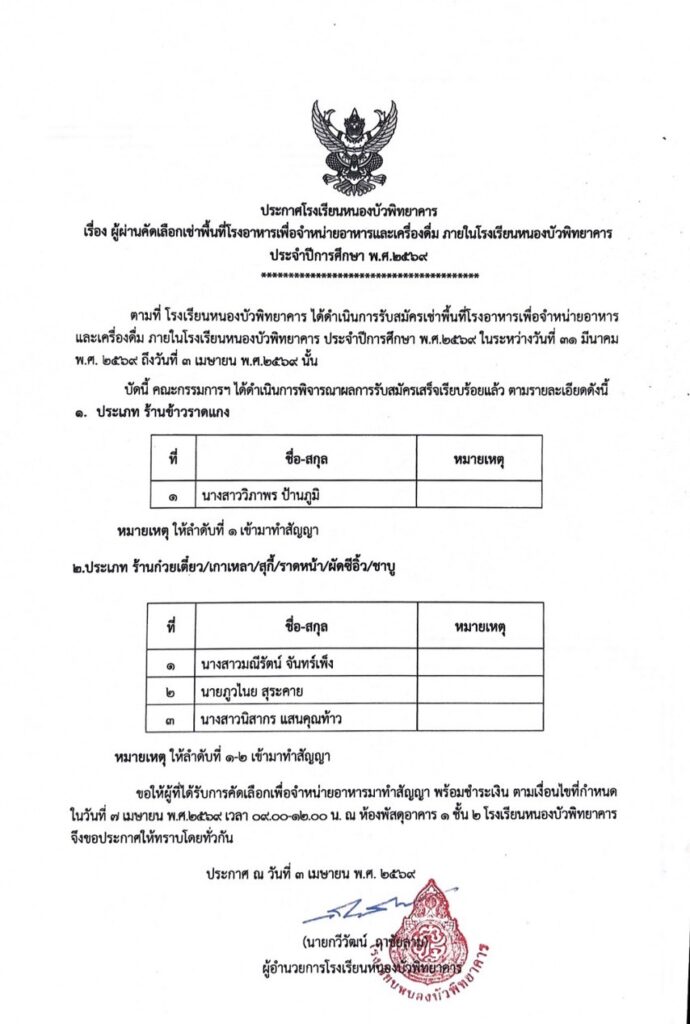 ประกาศผู้ผ่านคัดเลือกเช่าพื้นที่โรงอาหาร… 3 เมษายน 2026 admin ข่าวประชาสัมพันธ์ Spread the love ……ประกาศผู้ผ่านคัดเลือกเช่าพื้นที่โรงอาหารเพื่อจำหน่ายอาหารและเครื่องดื่ม ภายใน โรงเรียนหนองบัวพิทยาคารประจำปีการศึกษา พ.ศ.2569